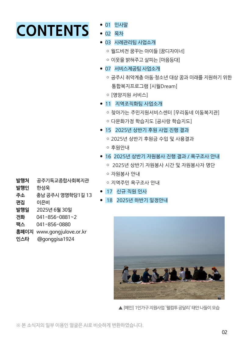 인사말과 팀별 사업소개, 상반기 후원 및 자원봉사 진행결과, 욕구조사 안내와 신규직원 인사, 2025년 하반기 일정 안내로 구성된 본 소식지에서, 다복했던 공주기독교종합사회복지관의 상반기를 살펴볼 수 있습니다.