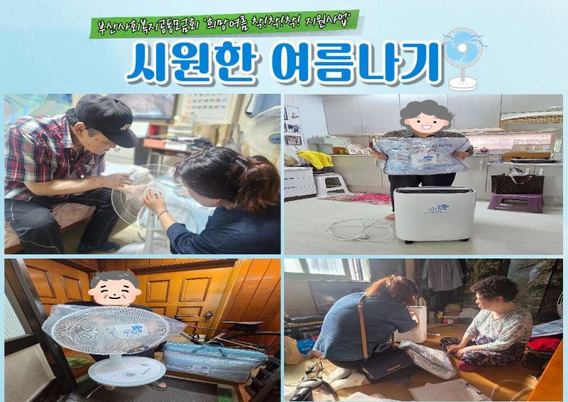 부산사회복지공동모금회의 2025년 기획 ‘희망여름 착!착!착! 지원사업’을 통해 관할 지역 내 56가정에 선풍기, 제습기, 여름이불을 전달하며 연일 이어진 폭염 속 이웃들의 건강한 여름을 응원했습니다.