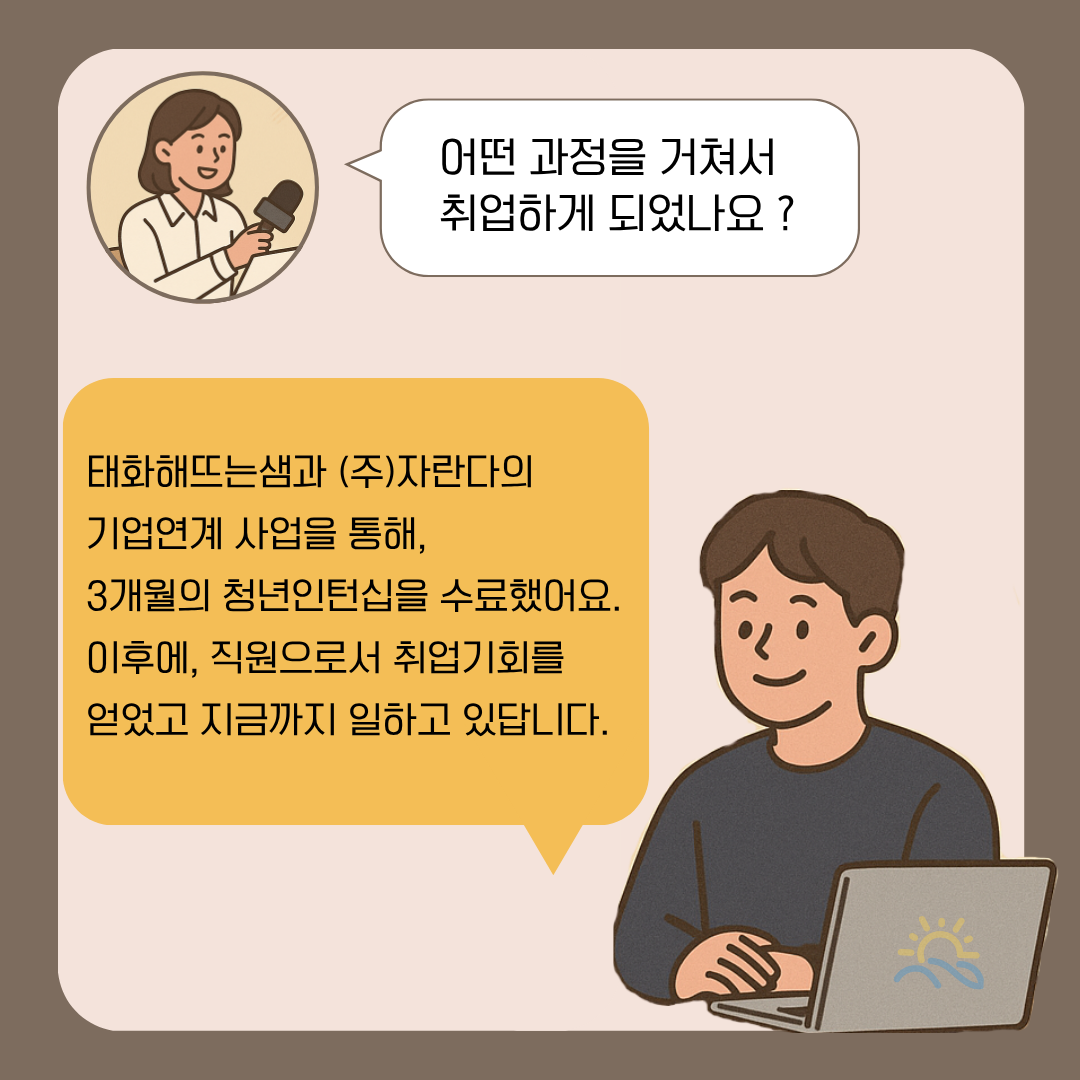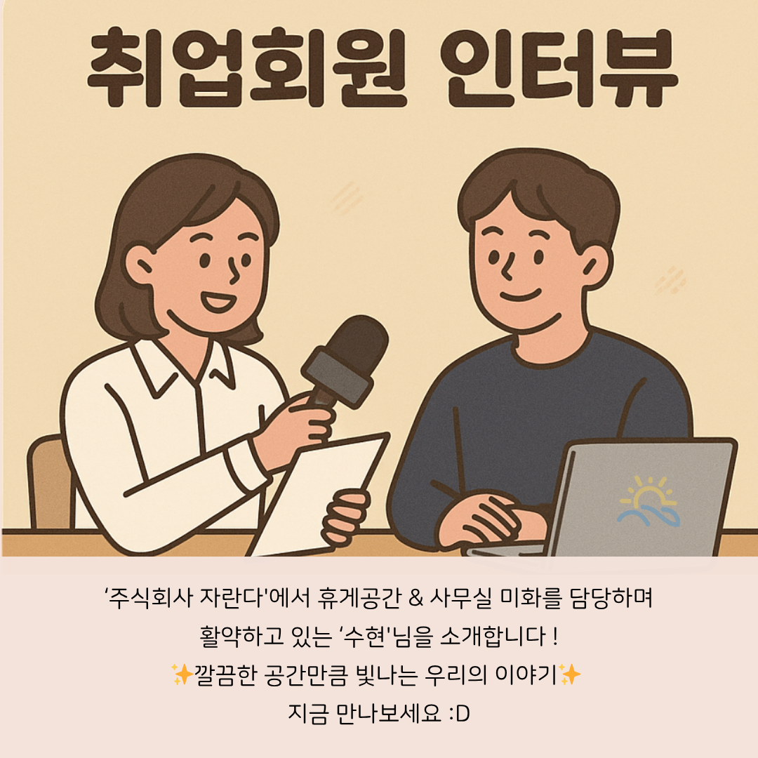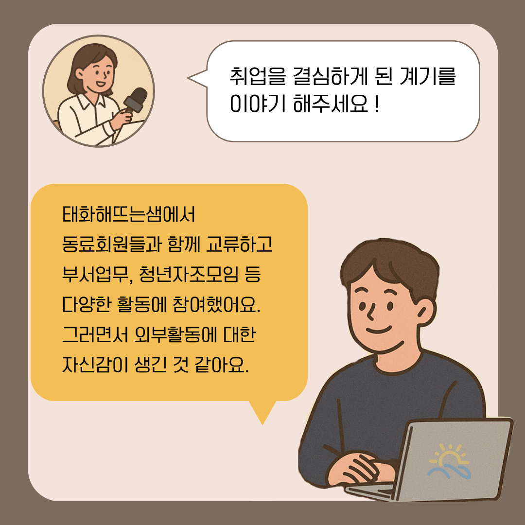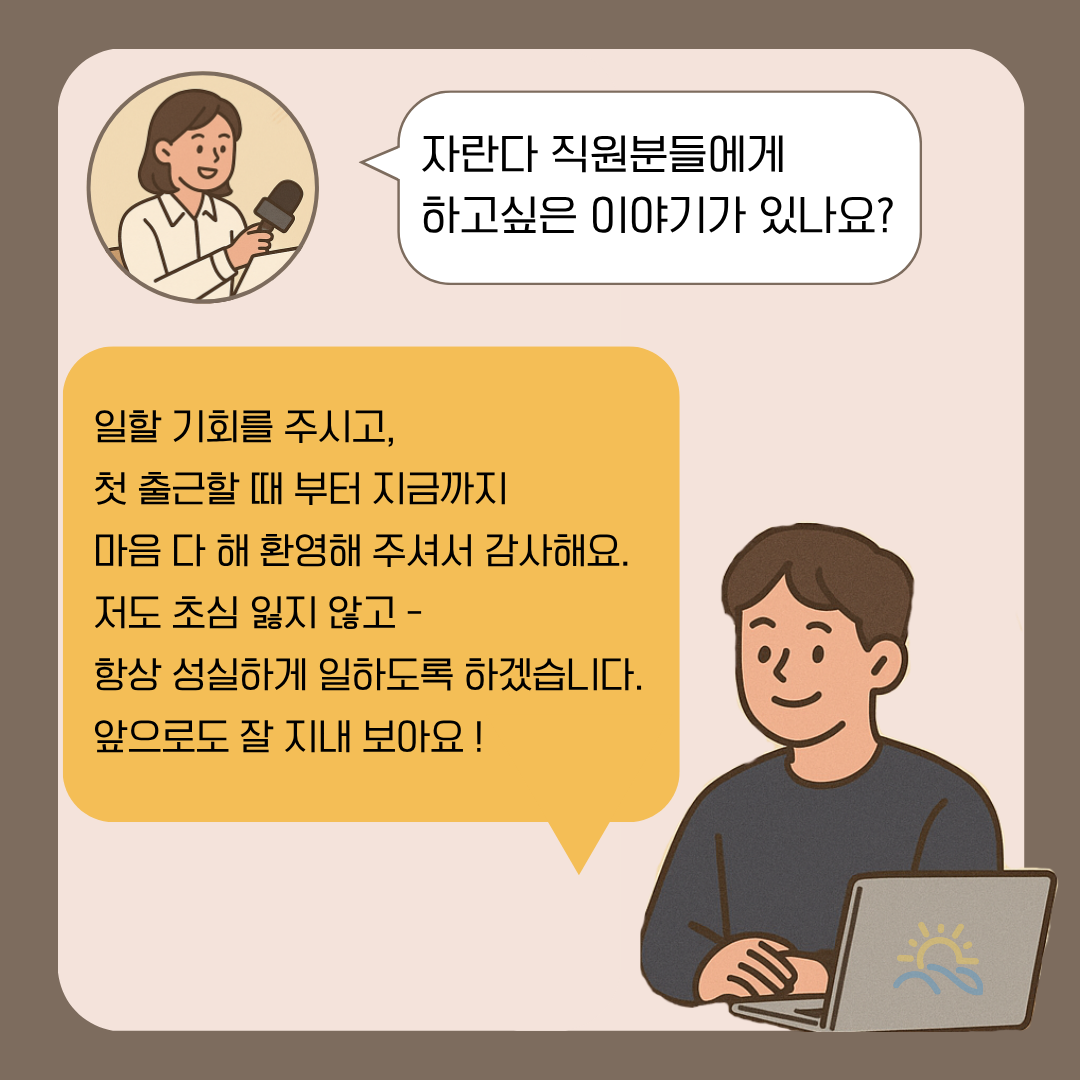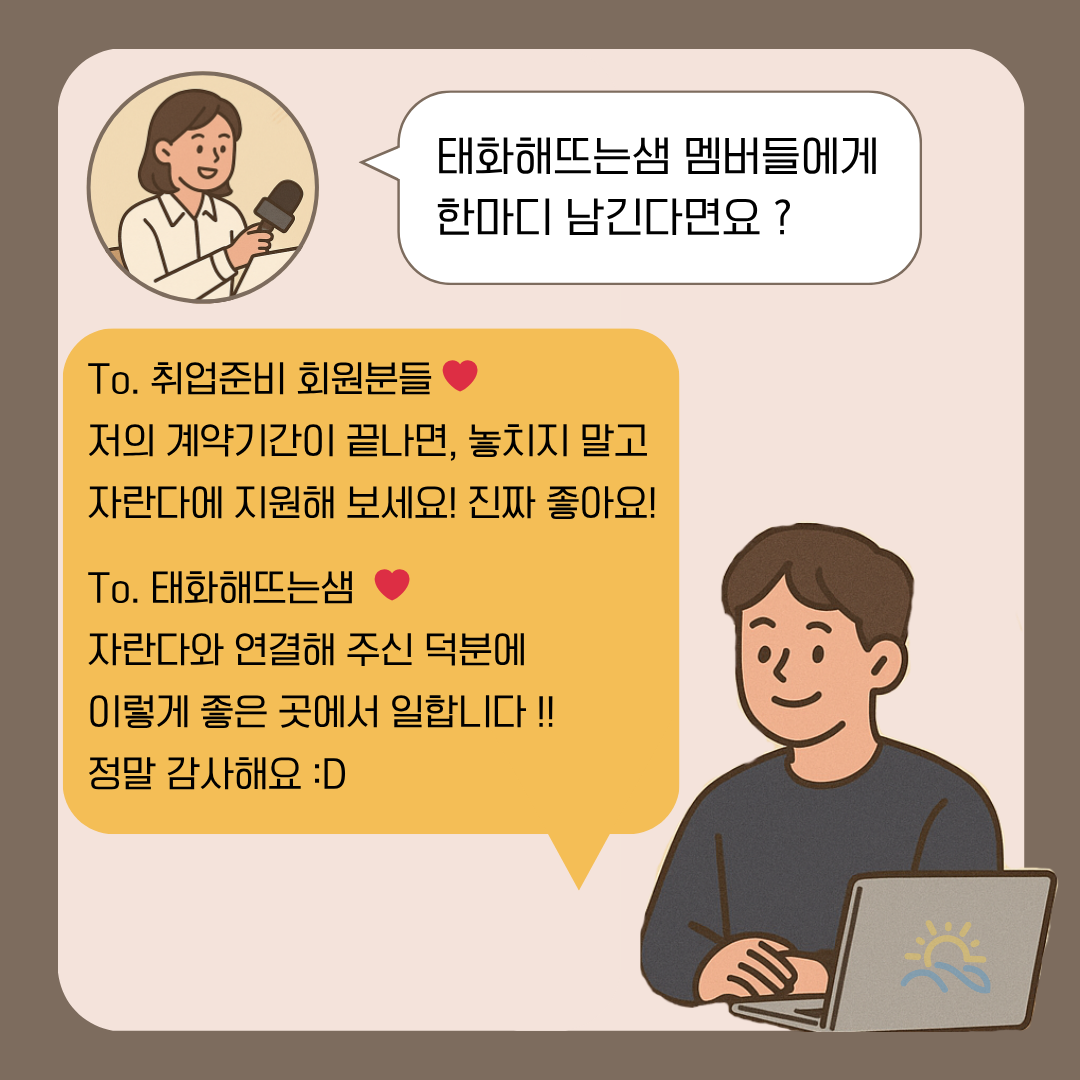 태화해뜨는샘 취업성공 스토리!청년 수현님의 도전, 드디어 과도적 취업까지 성공했어요.수현님의 멋진 활약 덕분에, 계약기간이 끝나면 다른 회원분들도 도전할 수 있는 일자리도 생겼답니다.어떤 이야기인지 궁금하시죠? 지금 바로 인터뷰를 확인해보세요!