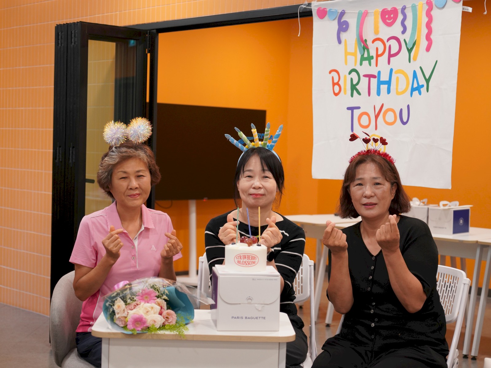 매월 첫째 주에는 돌담공동체 생일자를 모시고 꽃다발, 케이크, 편지를 전달하며 생일파티를 진행합니다. 작은 나눔이 큰 위로가 되는 순간입니다.
