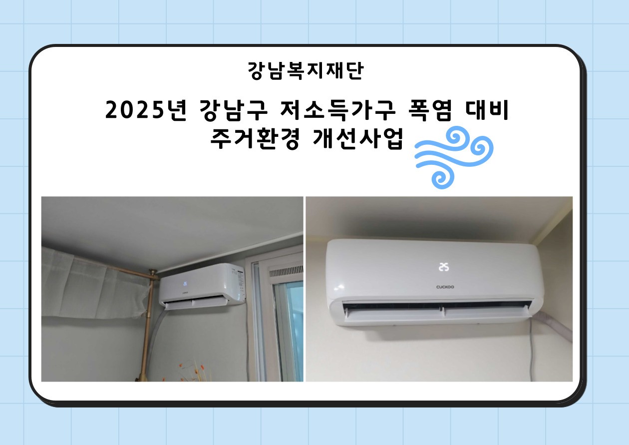 한참 무더웠던 2025년 여름, 강남복지재단에서 진행한 '2025년 강남구 저소득가구 폭염 대비 주거환경 개선사업'으로 지역주민들에게 에어컨을 지원하였습니다.