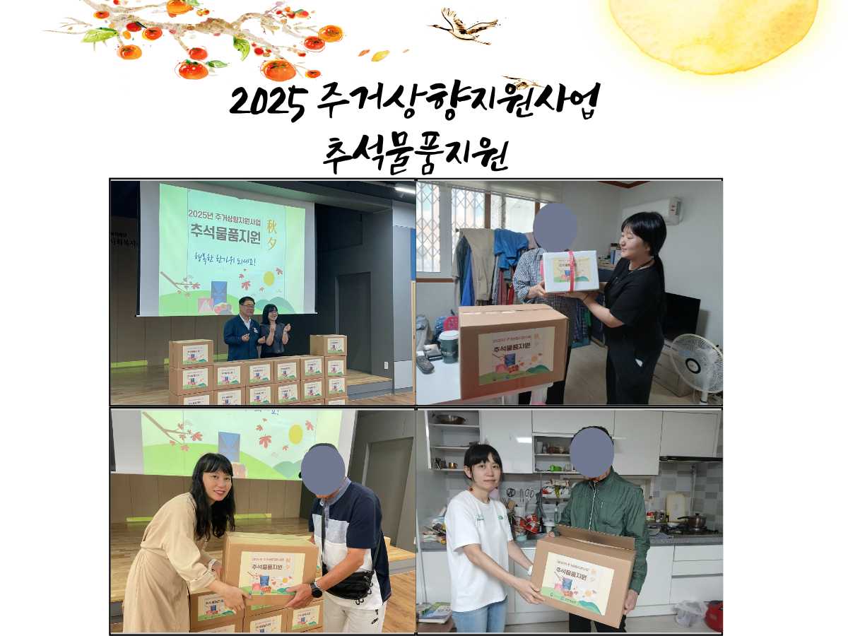 2025년 추석을 맞아, 주거상향지원사업 참여자 50명에게 김치, 간편식, 밑반찬, 송편과 두유 등으로 구성된 추석 선물 꾸러미를 전달하였습니다. 직접 가정 방문 및 내방 수령을 통해 추석 인사와 안부 확인도 함께 진행했습니다.