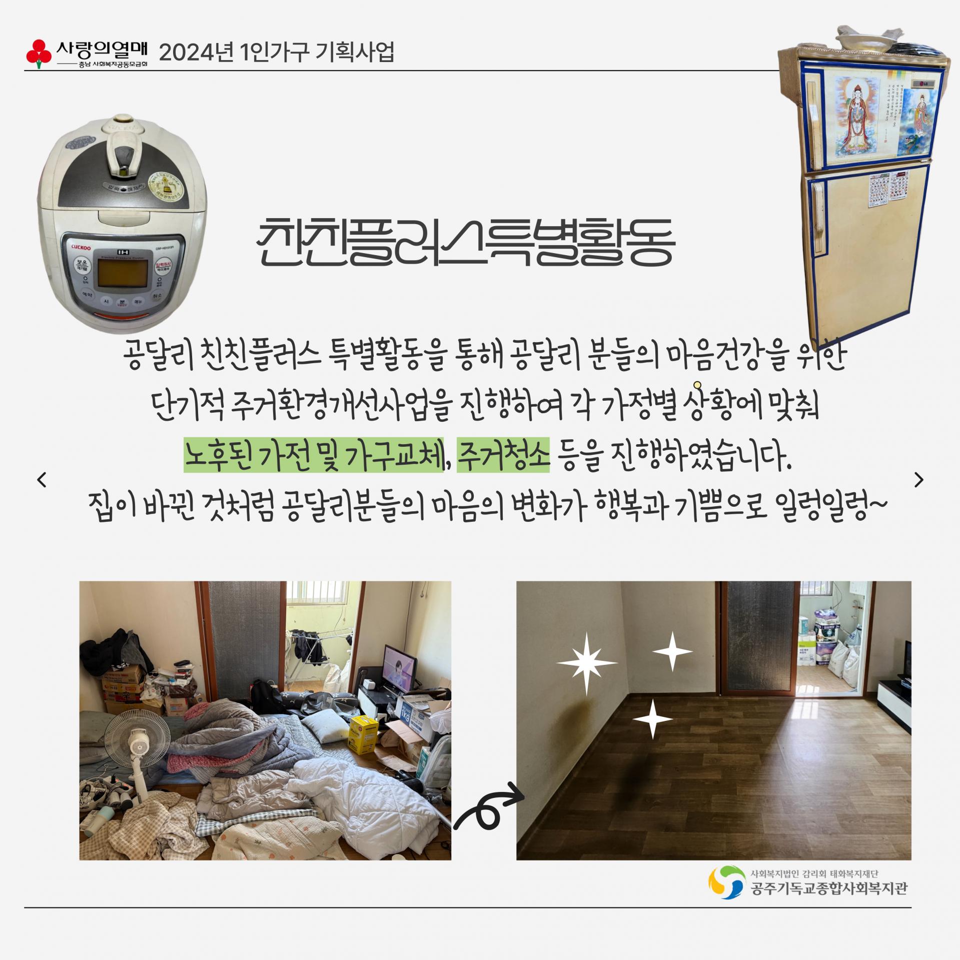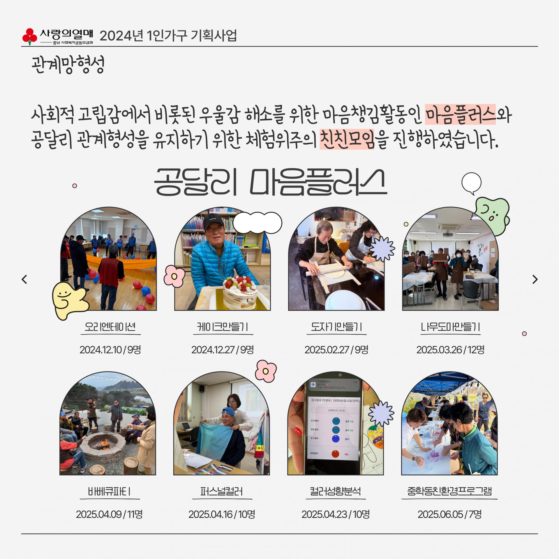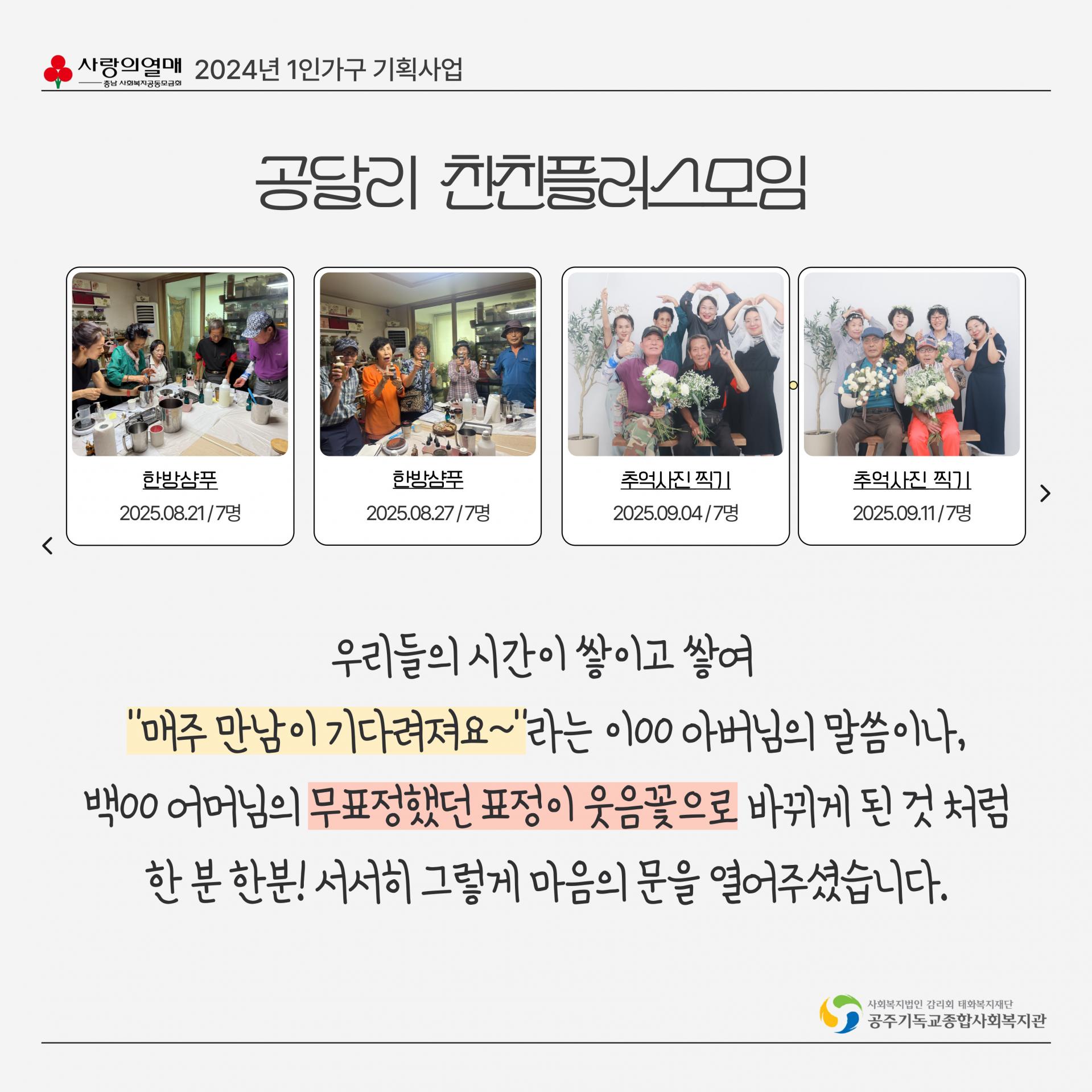 - 내 용 : 공주시 달방 1인가구 대상 사회적 고립감 해소를 위한 사회관계망 형성지원사업 웰컴투 공달리 사업 진행 보고