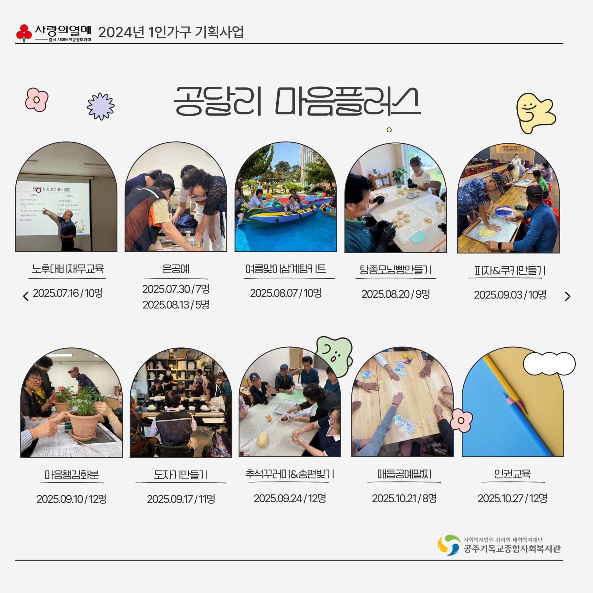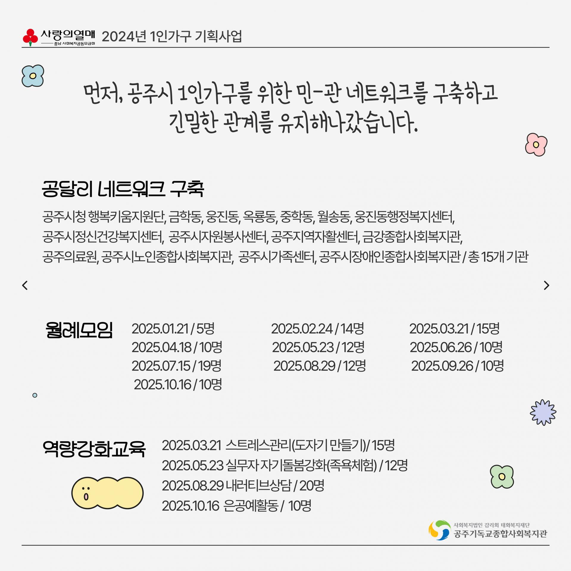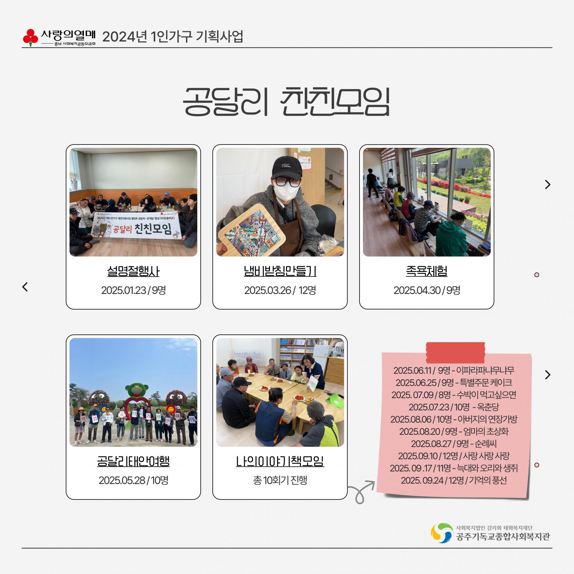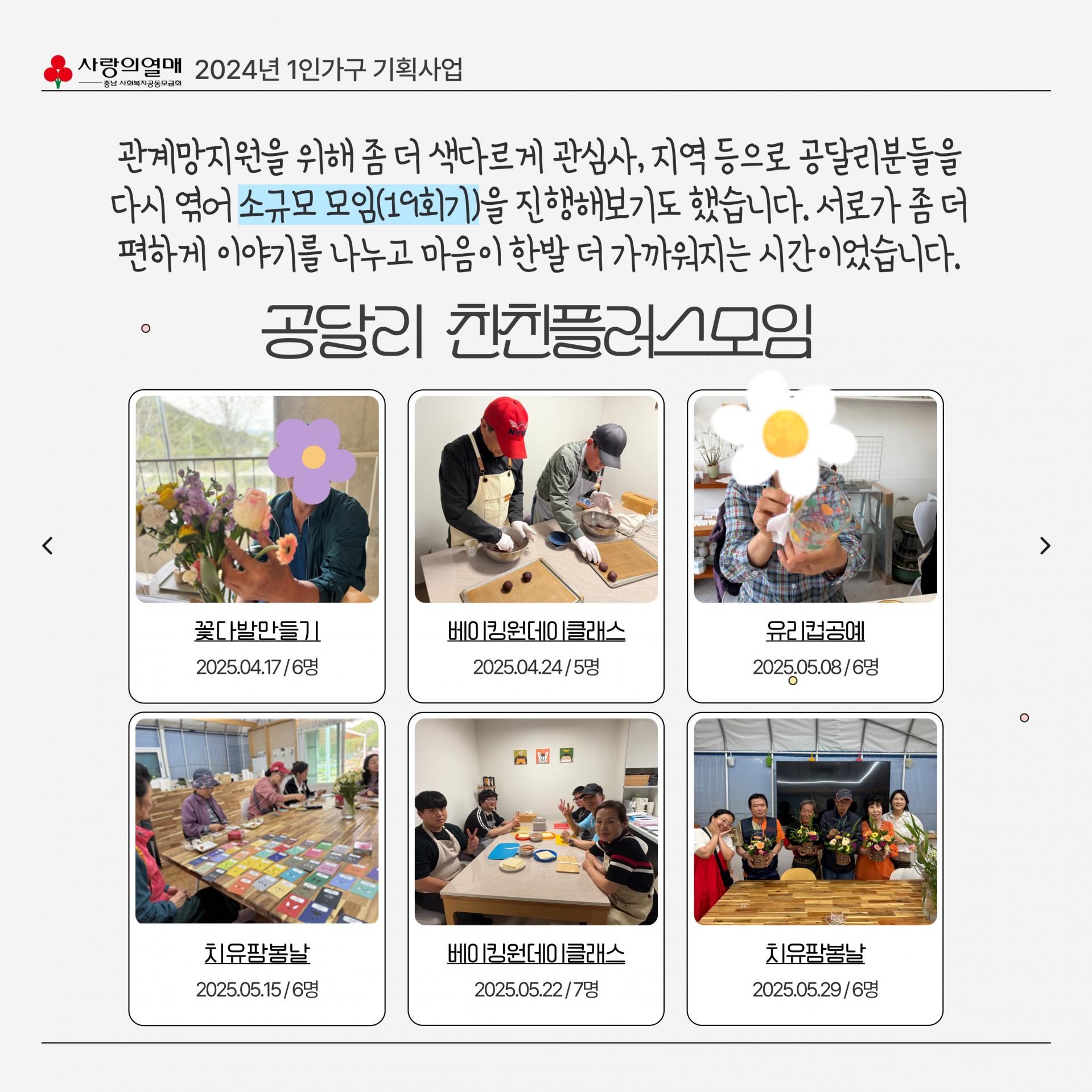 - 내 용 : 공주시 달방 1인가구 대상 사회적 고립감 해소를 위한 사회관계망 형성지원사업 웰컴투 공달리 사업 진행 보고